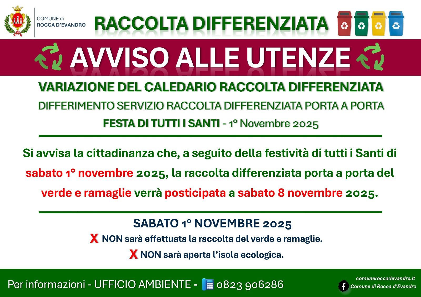 Si avvisa la cittadinanza che, a seguito della festività di TUTTI I SANTI di sabato 1° novembre 2025, il servizio di raccolta differenziata "porta a porta" del verde e delle ramaglie subirà una variazione.