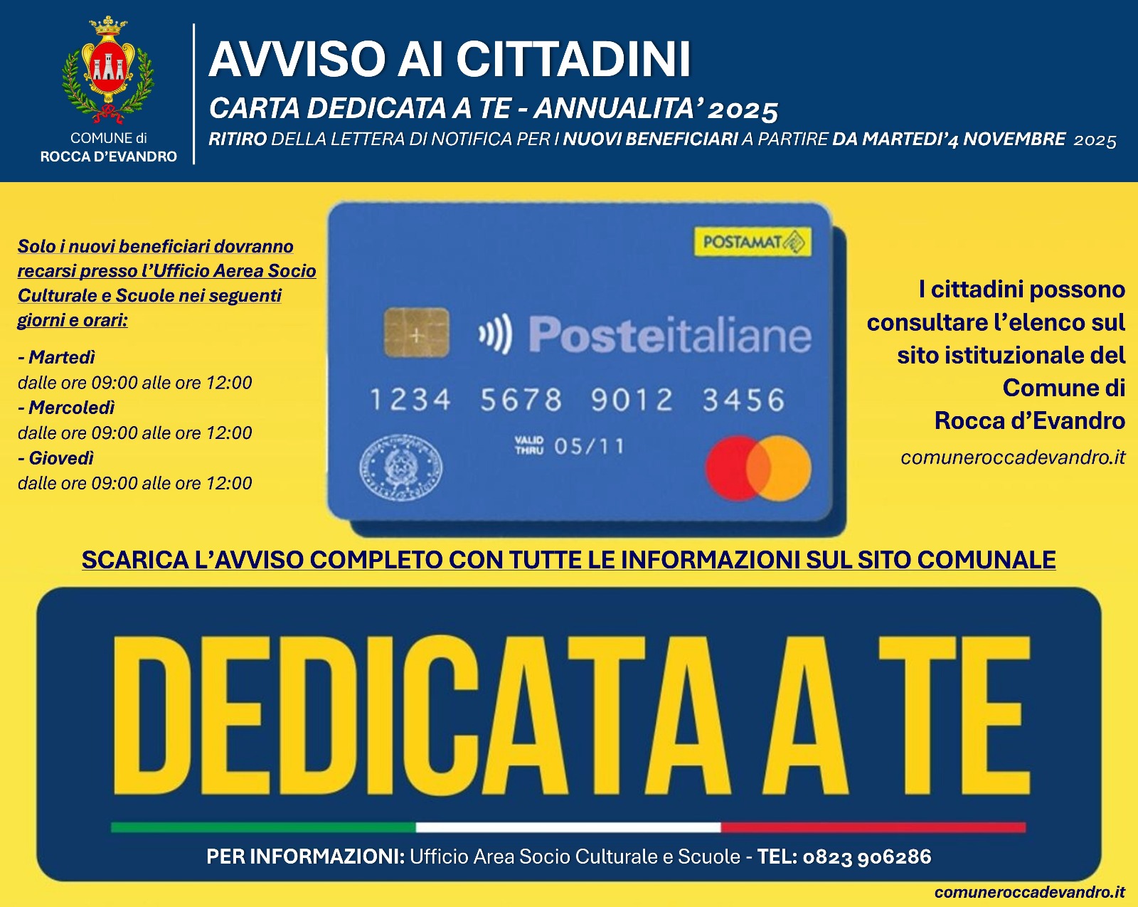 L’Amministrazione Comunale informa la cittadinanza che l’INPS ha trasmesso al Comune di Rocca d’Evandro l’elenco dei beneficiari della Carta solidale "DEDICATA A TE" per l’annualità 2025.